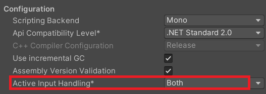 3. Configuration 항목에서 Active Input Handling을 "Both" 로 변경
