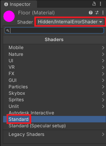 즉 문제는 Material의 Shader가 잘못 설정된 것이 원인이다.