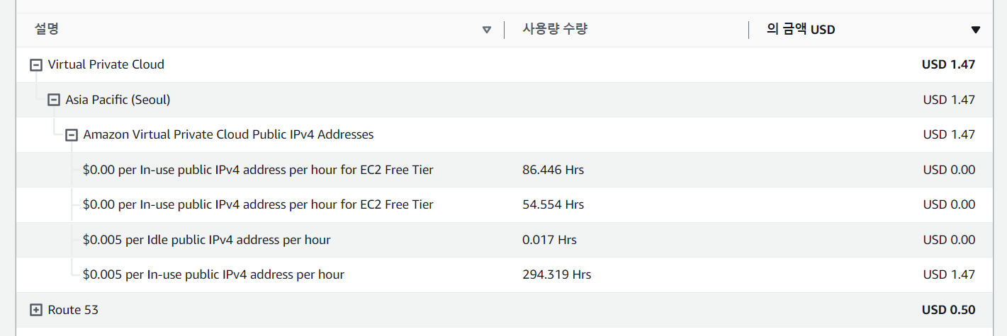 - $0.00 per In-use public IPv4 address per hour for EC2 Free Tier --> 비용 청구 안됨